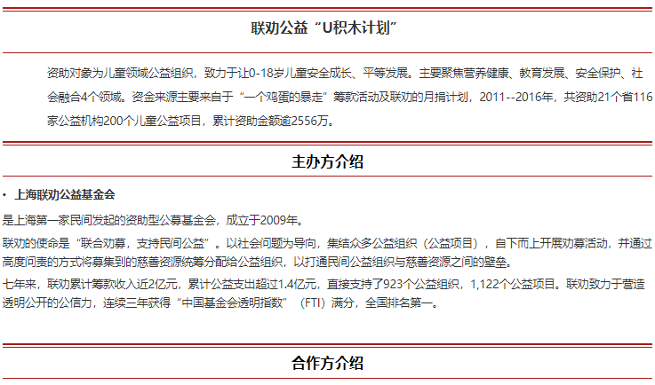 注:此次活动的报名费和筹款费用除去保险费等活动费用后,将捐助到联劝公益U积木计划,支持流动儿童在内的儿童公益项目。