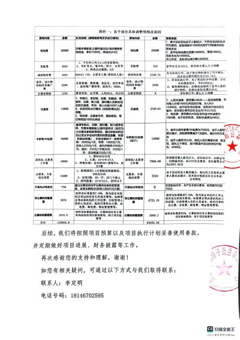 | 交通费 | 1、李晓云、李定明、刘倩、张融诚、谭南希、沈静、陈小丽、顾玲霞人员参加活动的交通费,平均:单人价格1600*人数8,会因实际出行情况(如因距离远近)调整。 2、物流费:志愿者马甲、展架框架、等已有物品1000元来回 | 13,800.00 元 |