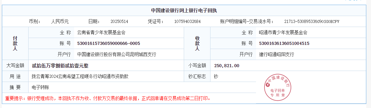 第四期拨款:2025年5月14由广大爱心人士捐赠爱心善款250821元已拨至昭通市青少年发展基金会,春节为昭通市11个县市区的3000名孩子送去棉被。