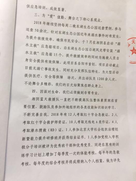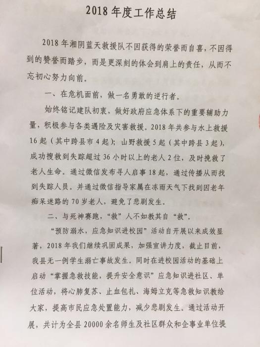 2018年湘阴蓝天救援队不因获得的荣誉而自喜,不因得到的赞誉而踏步,而是更深刻的体会到肩上的责任,从而不忘初心努力向前。
