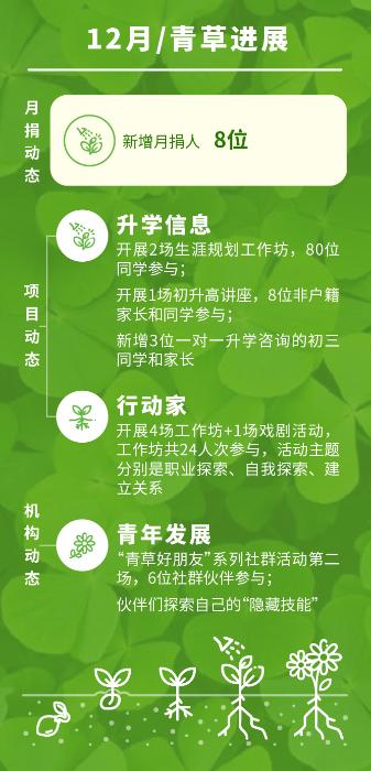 青草升学信息项目通过升学信息讲座、一对一升学咨询、小红书、微信服务号和视频号等线上平台线上直播课、短视频和图文内容科普,支持城市流动儿童及其家长了解不同阶段各种升学政策,普及相关升学信息,进而可以更好支持流动儿童家庭规划其升学路径及未来职业发展,为他们的持续学习打下基础。