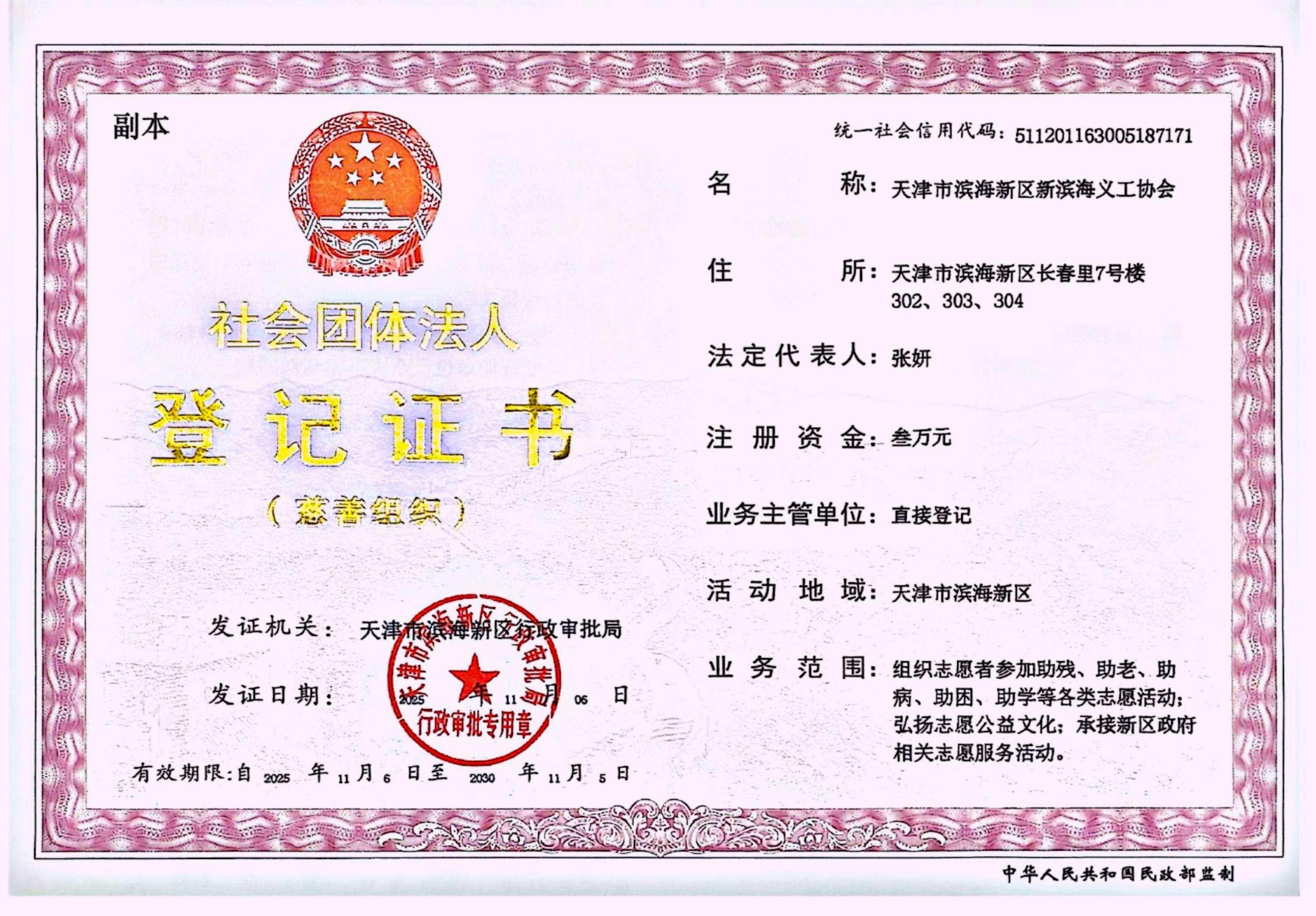 天津市滨海新区新滨海义工协会成立于2010年11月15日,是一家完全由社会爱心人士自发成立的公益组织。协会现任会长张妍系滨海新区政协委员、天津市青联常委。协会作为专业公益机构,对内服务会员,开展各类培训;对外开展公益项目(项目策划实施、公益组织孵化培育)和从事志愿服务。协会还连续多年承接中央、天津市、滨海新区公益创投项目,具有丰富的公益项目运营经验和各类社会资源,已形成助老、助学、助困、助病、助残和社会服务等多方面的公益项目和志愿服务体系。