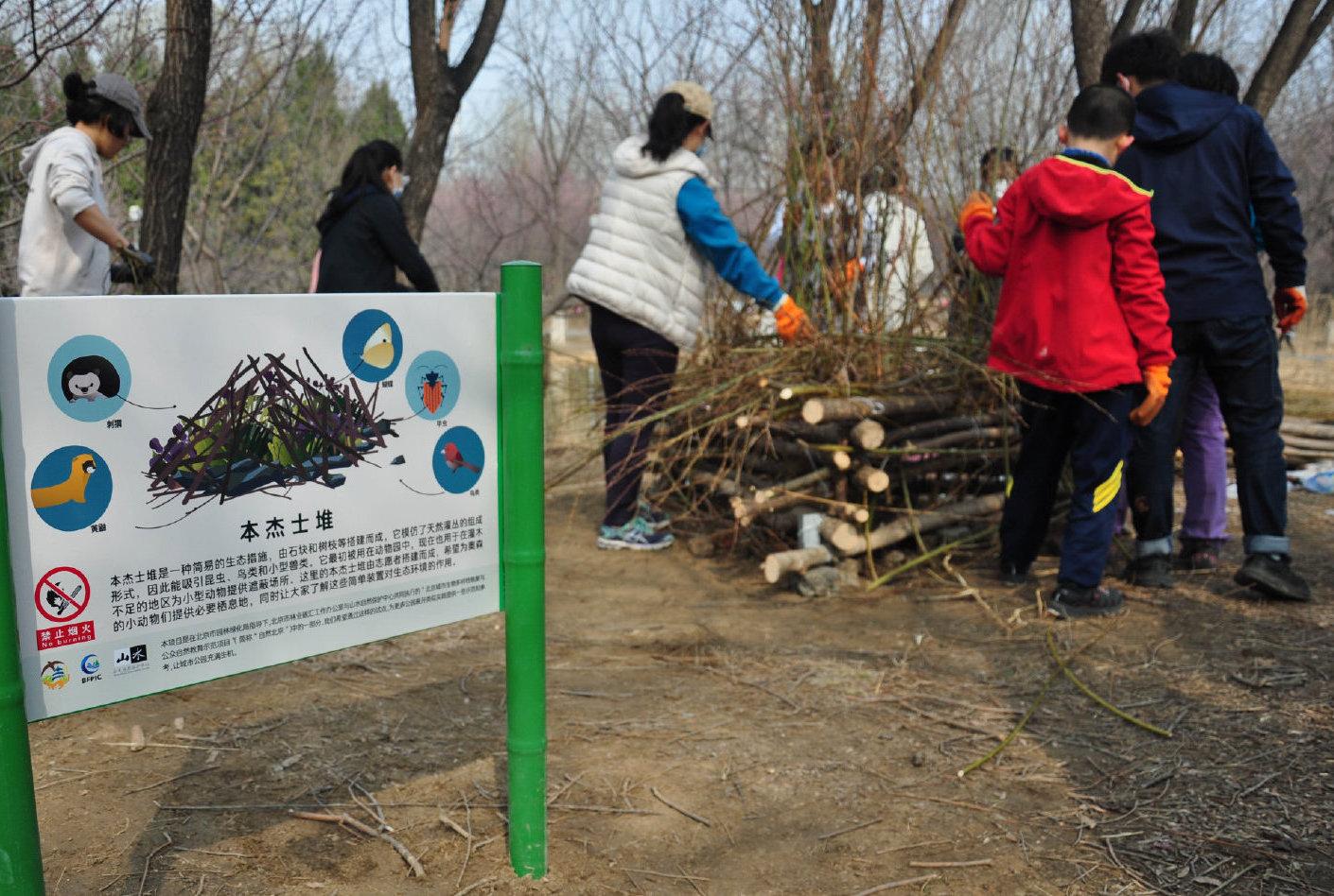 在北京奥林匹克森林公园搭建本杰士堆,为城市中的野生动物与昆虫提供躲避、休憩和觅食的空间。