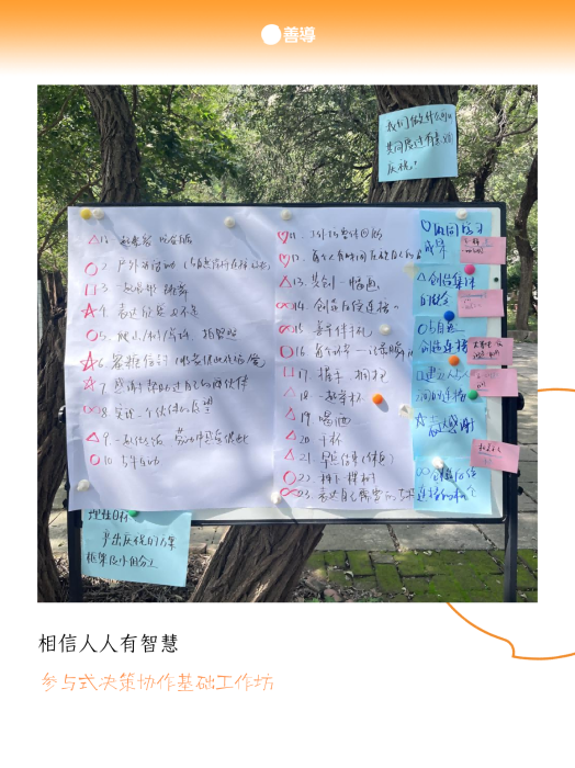 透过大白纸和棒棒彩、罄和音乐、聆听和提问、流程和当下、推动有形的产出和塑造无形的关系,我们真正努力的是让那些蕴藏在我们公益初心之内的价值观,例如平等公正、参与、自主、多元,成为我们自己的一部分、并且在我们的组织中“活”出来。
