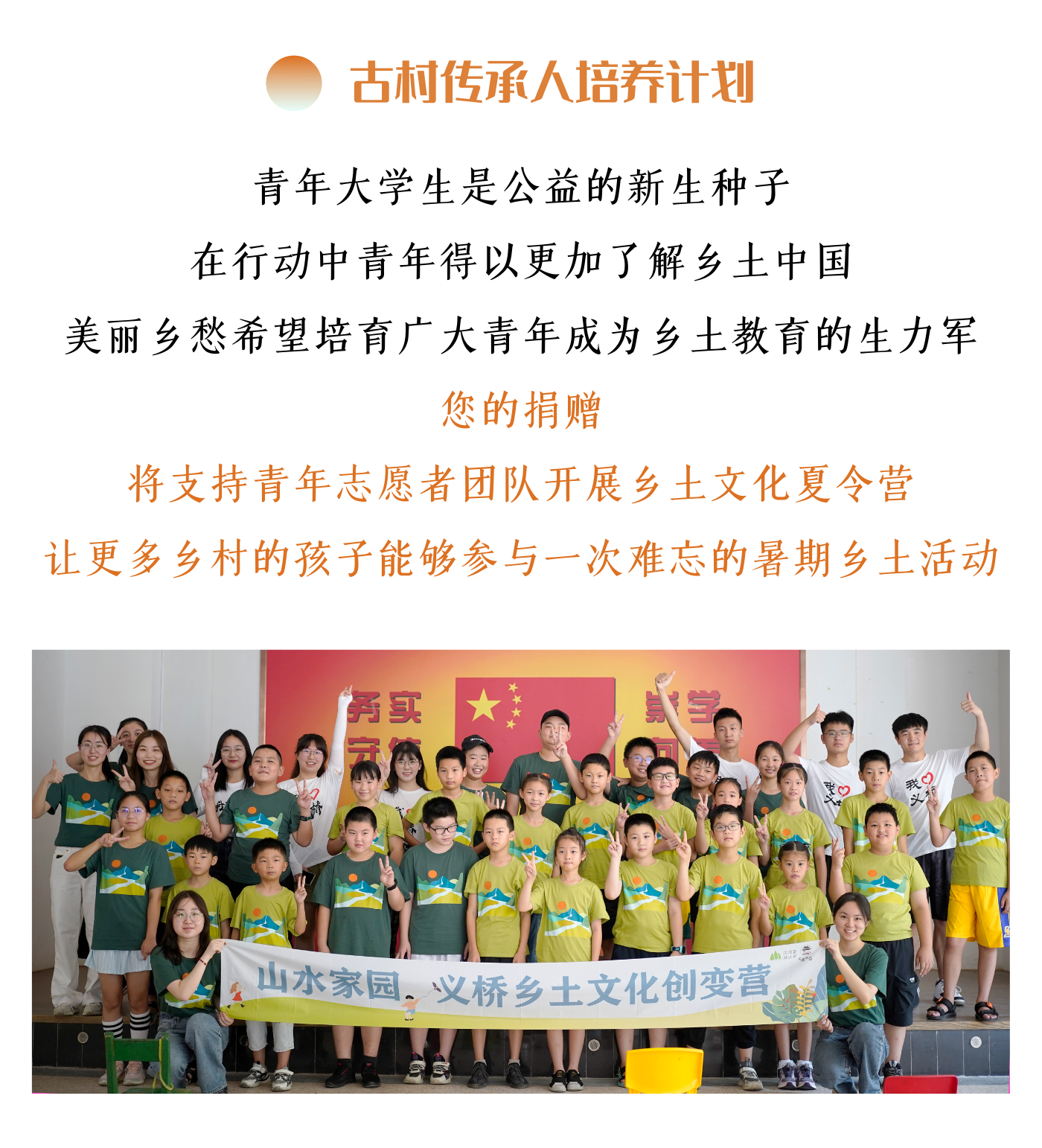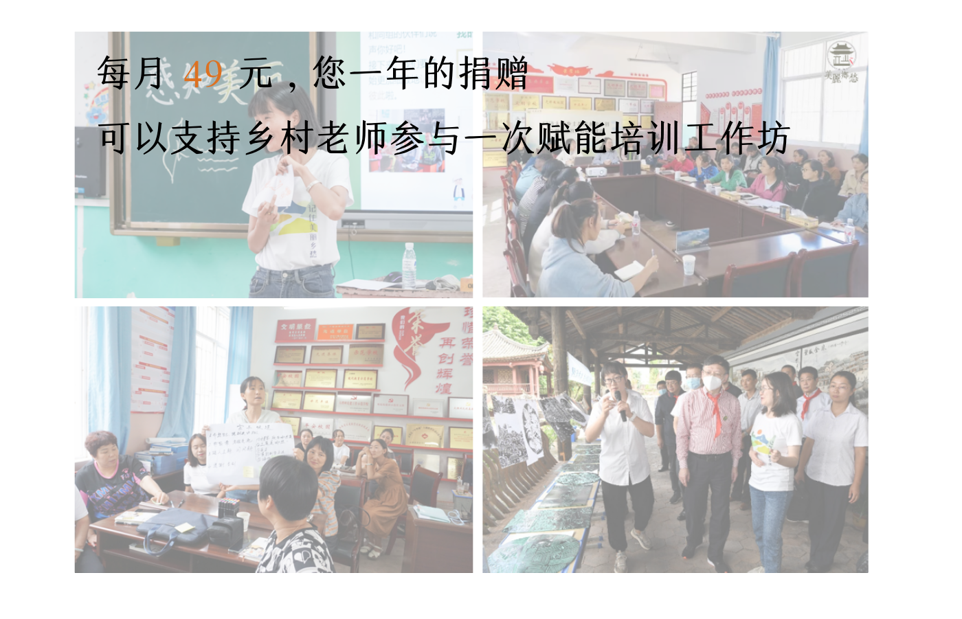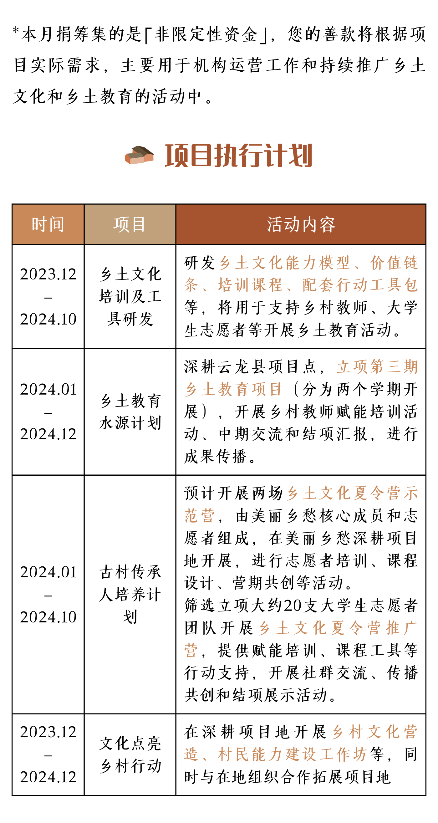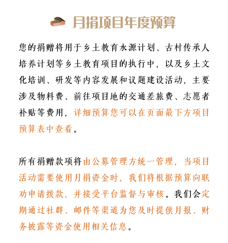 | 培训费 | 乡土教育水源计划和古村传承人培养计划邀请机构内部或外部讲师开展赋能培训课程,预计开展10场,每场1-2名培训师,1000元/人*10人=10000元 | 10,000.00 元 |