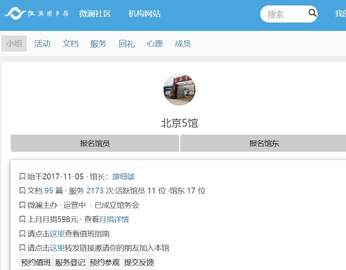 即在周一到周五的上学日期间,进入学校,在该馆内承担开馆职能,负责为小读者登记图书借阅和整理书架等工作的志愿者。馆员志愿者可以同时是馆东,也可以不是。目前每个微澜图书馆都有自己的馆员志愿者团队。每个馆员志愿者平均每月到馆服务1-2次,大家用轮流排班的方式保障每个开馆日都有人力。