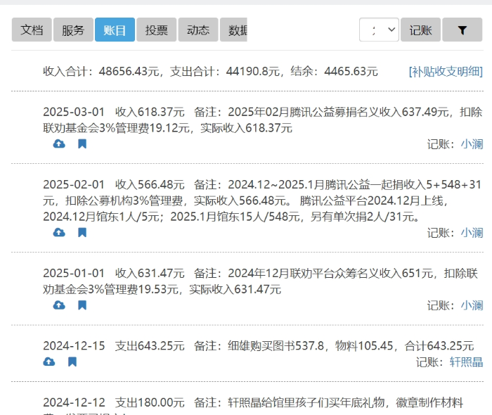 | 备用金 | 由微澜图书馆整体统筹使用,用于各馆运营中可能出现的意外事件处理,如未开支,则一直留存备用 | 500.00 元 |