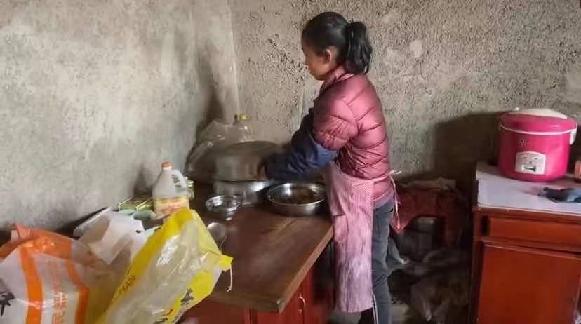 大门紧闭是小琪家的常态,当我敲门时,小琪急忙跑过来开门,一脸疑惑问我是谁。问完之后才打开大门,小小的脑袋从门缝探出,笑呵呵的问候我,请我进屋后,然后小琪就去忙自己的事了。她像一个小大人一样,利索地收拾完屋子就生火帮母亲做饭。了解之后得知因为母亲不能干活,所以家里大大小小几乎所有的家务都由小琪承担。