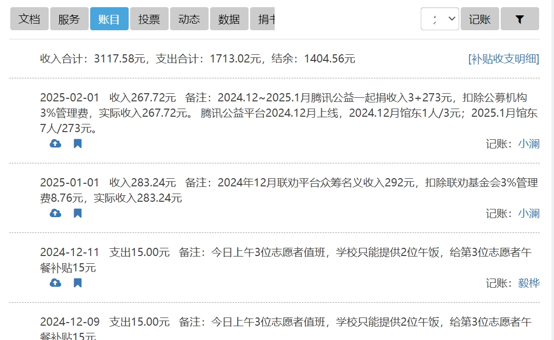 | 备用金 | 由微澜图书馆整体统筹使用,用于各馆运营中可能出现的意外事件处理,如未开支,则一直留存备用 | 500.00 元 |