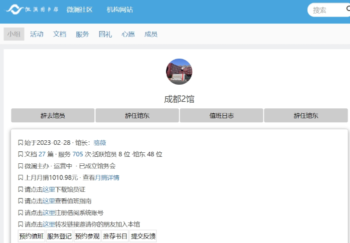 即在周一到周五的上学日期间,进入学校,在该馆内承担开馆职能,负责为小读者登记图书借阅和整理书架等工作的志愿者。馆员志愿者可以同时是馆东,也可以不是。目前每个微澜图书馆都有自己的馆员志愿者团队。每个馆员志愿者平均每月到馆服务1-2次,大家用轮流排班的方式保障每个开馆日都有人力。
