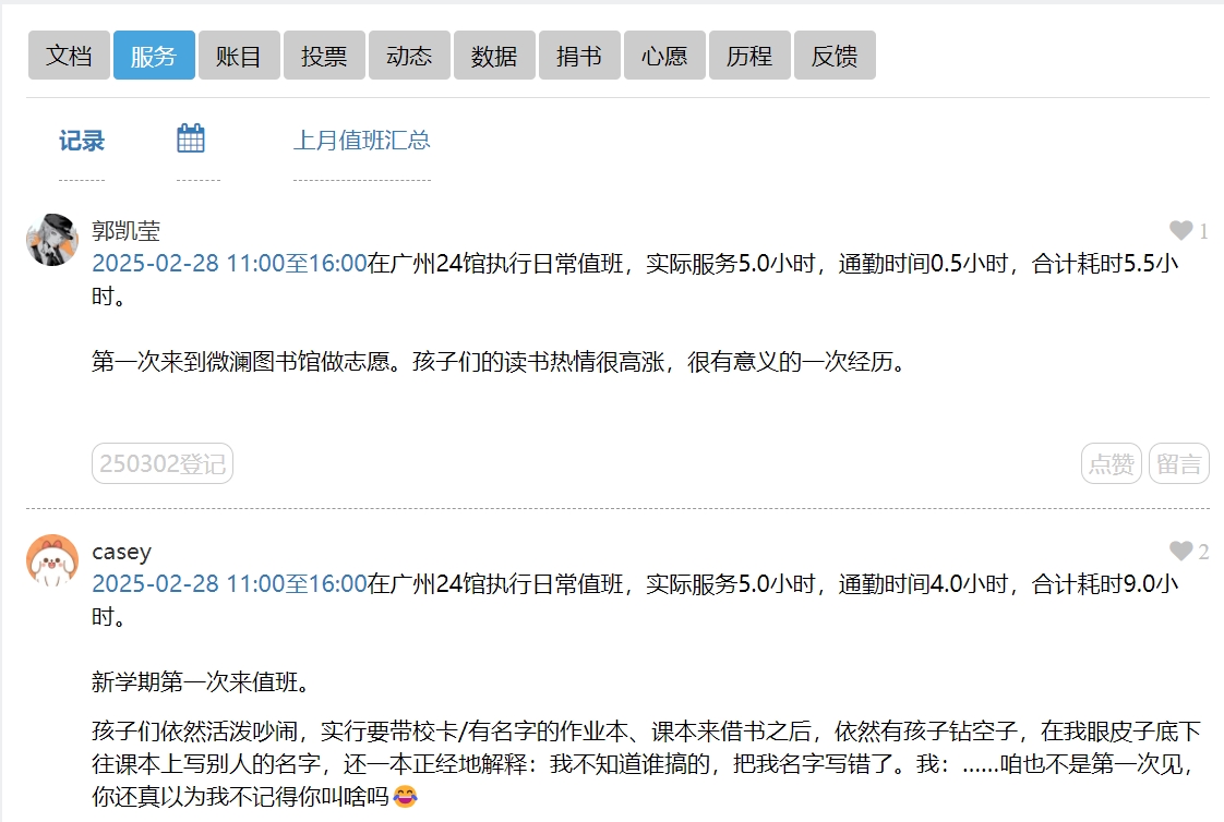 即在周一到周五的上学日期间,进入学校,在该馆内承担开馆职能,负责为小读者登记图书借阅和整理书架等工作的志愿者。馆员志愿者可以同时是馆东,也可以不是。目前每个微澜图书馆都有自己的馆员志愿者团队。每个馆员志愿者平均每月到馆服务1-2次,大家用轮流排班的方式保障每个开馆日都有人力。