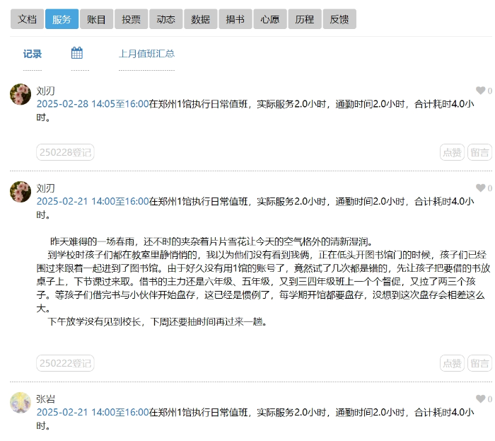 即在周一到周五的上学日期间,进入学校,在该馆内承担开馆职能,负责为小读者登记图书借阅和整理书架等工作的志愿者。馆员志愿者可以同时是馆东,也可以不是。目前每个微澜图书馆都有自己的馆员志愿者团队。每个馆员志愿者平均每月到馆服务1-2次,大家用轮流排班的方式保障每个开馆日都有人力。