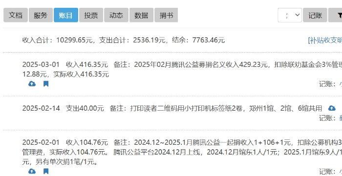 | 备用金 | 由微澜图书馆整体统筹使用,用于各馆运营中可能出现的意外事件处理,如未开支,则一直留存备用 | 500.00 元 |