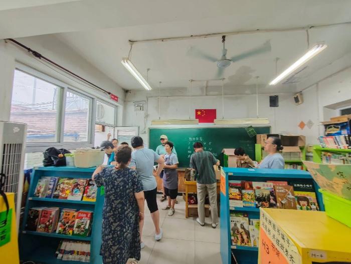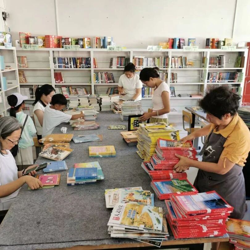 “图书室门打开不一会,一群群手捧图书的孩子们就涌进来了~我和两位姑娘接过孩子们手里的图书登记归架,又把新书录入分类和标签。天热,汗水顺着脸颊滴落下来。孩子们看过的书也夹带着尘垢,不一会儿两只手都黑黢黢的了。可是看着尘封已久的图书宝藏再我们手中挖掘利用起来了,尤其是看到孩子们热切期盼的眼神和言行,那份满足和开心,你懂的~”