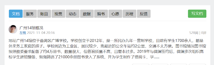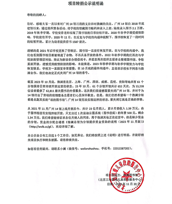 项目结项,资金转捐其他微澜图书馆已执行完毕,详情可关注微澜图书馆公众号-微澜社区-广州14馆(https://park.sanzhi.org.cn/index.php?app=group&ac=show&id=78)。对于广州14馆的建设,运营,闭馆,资金转捐,过程中伙伴们的记录,以上链接均有详细记录。