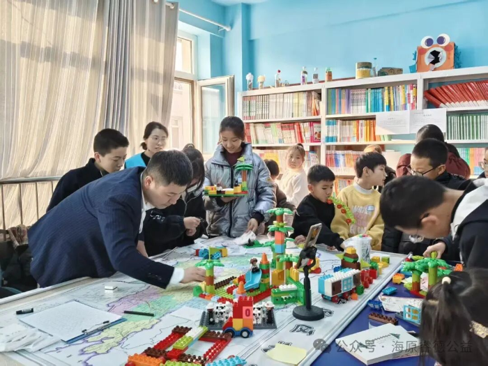 乐高拼搭家乡地标是最受欢迎的角落。理事长展开一张巨大的海原地图,孩子们用积木搭建心中的家乡地标:关桥的“梨花镇”、李旺的“百吨王”,还有“红梅杏”“震柳”……方寸之间,是孩子们对这片土地最稚嫩也最深情的表达。