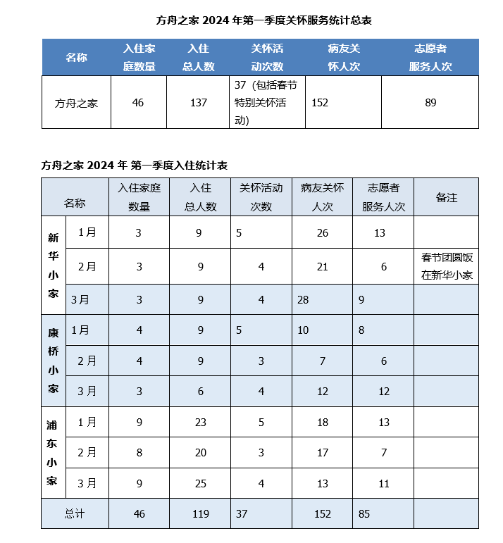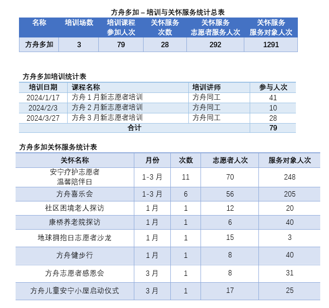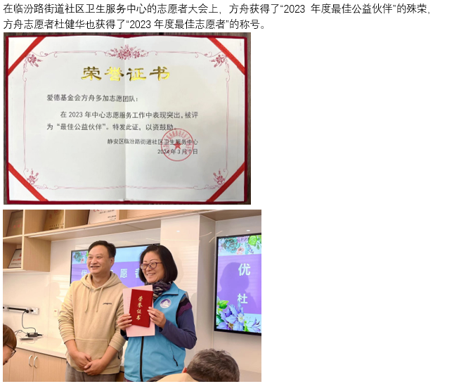2024年第一季度,方舟各项服务进展顺利。本季度,位于上海浦东新区迎博社区卫生服务中心的方舟儿童安宁小屋正式投入使用,标志着方舟勇于承担社会责任,勇于将方舟之家的温度和爱心复制到医院中,让每一位末期疾病患儿都能在亲人的陪伴下,舒适、有尊严地度过生命的最后阶段的决心。在临汾路街道社区卫生服务中心的志愿者大会上,方舟获得了“2023年度最佳公益伙伴”的殊荣,方舟志愿者杜健华也获得了“2023年度最佳志愿者”的称号。此外,方舟良善市集的发展更具规模化,两场以“地球拥抱日”和“万物生长”为主题的活动分别在静安区MOHO MALL和金融街购物中心进行。方舟还在新春之际举办了“为爱健步行”,感动更多健康人群通过锻炼身体的方式,参与公益。方舟之家在志愿和学堂老师们的陪伴之下,一起吃春节团圆饭、到公园春游、每周的方舟学堂课程仍然是孩子们期待的活动,同时也收到了学堂老师、平和学校三年级学生和各界爱心人士捐款的粮油米面、生活物资等。