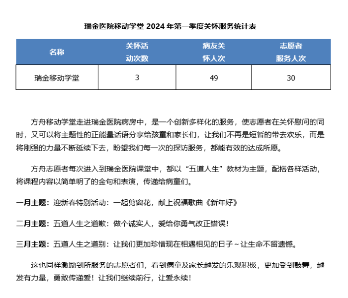 方舟移动学堂走进瑞金医院病房中,是一个创新多样化的服务,使志愿者在关怀慰问的同时,又可以将主题性的正能量话语分享给孩童和家长们,让我们不再是短暂的带去欢乐,而是将刚强的力量不断延续下去。方舟志愿者每次进入到瑞金医院课堂中,以“五道人生”教材为主题,配搭各样活动,将课程内容以简单明了的金句和表演,传递给病童们。