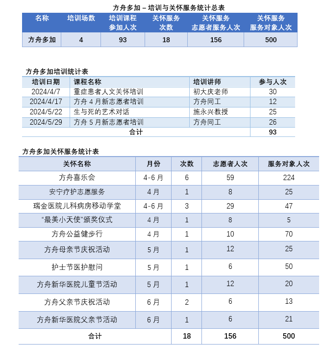 2024年第二季度,方舟各项服务进展顺利。本季度,方舟开始在新华医院儿科病房提供志愿服务。护士节期间,方舟爱心志愿者亲手烘焙了可口的饼干送至瑞金医院、新华医院、临汾路街道社区卫生服务中心和迎博社区卫生服务中心,慰问辛苦工作的医生和护士们。我们也在重病患儿德德的床前,为她特别举办了“最美小天使”的颁奖典礼,让德德在回老家前留下了美好的回忆。瑞金医院移动学堂第二季度的课程中,在爱和梦想的主题外,特别加入了环保内容。每次志愿者都为住院的孩子们和家长们带去欢乐与坚强前行的动力。此外,方舟志愿者能力建设也在稳步推行中。本季度,我们邀请了上海市安宁疗护管理中心专家组组长施永兴教授,为志愿者们带来以“生与死的艺术对话”为主题的培训。在社会倡导方面,方舟与SICF团队合作,举办了“跨越:方舟公益健步行”活动,让更多人了解方舟服务的重症患儿及安宁患者群体,了解方舟永续关怀的理念。