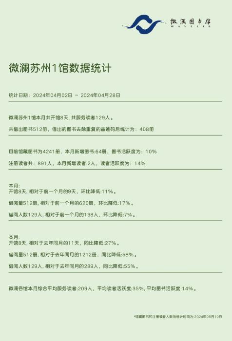 3)现在图书馆保持每周两次的开放节奏,4月合计开馆8天,服务读者129人,借出图书408册。