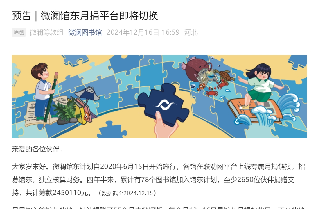 2024年9月新修订的《慈善组织公开募捐管理办法》正式生效,新规要求所有公开募捐活动必须单独备案。微澜馆东计划各馆独立筹款的操作,受限于此已不再合规。2024年12月15日,微澜公众号发布推文,介绍了馆东月捐平台更换原因和时间表,详情可点击:https://mp.weixin.qq.com/s/R3h4GPVATlGKi-Qd9aL5Ng,