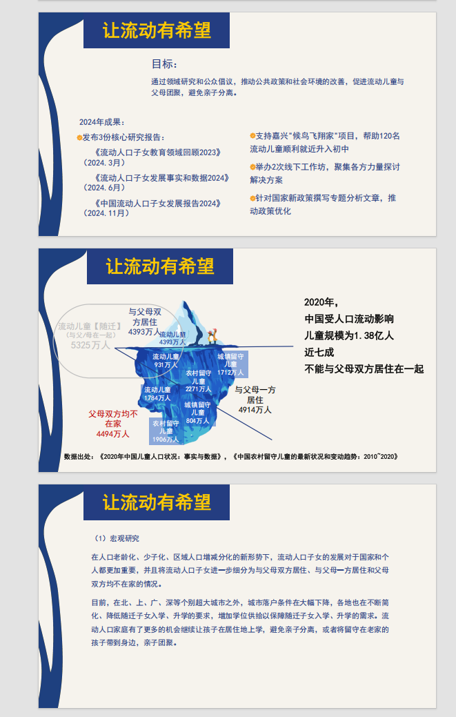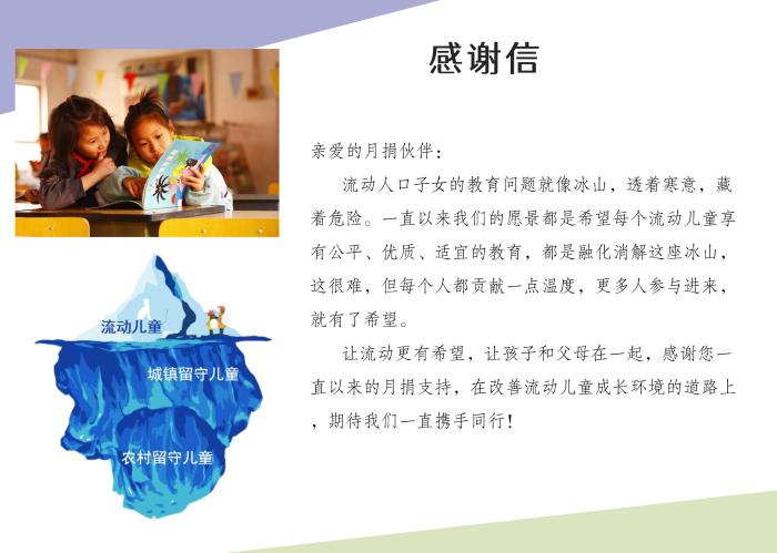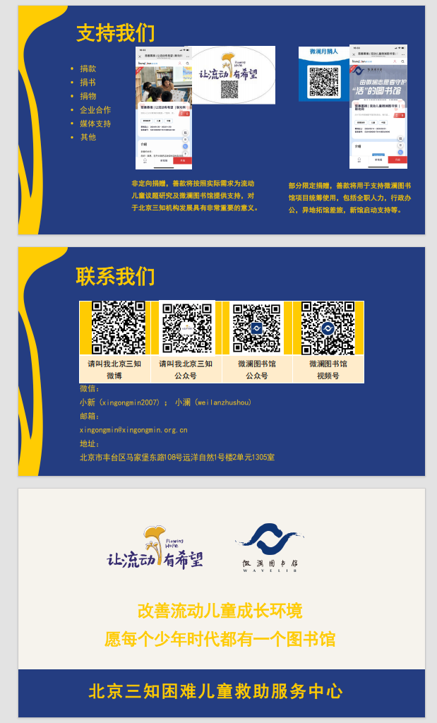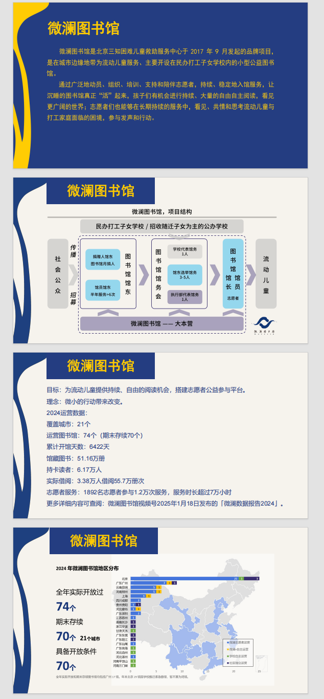 感谢大家与北京三知,以及微澜图书馆一直在一起,2024年度报告欢迎大家了解。希望可以帮助大家对流动人口子女发展状况和微澜图书馆的工作以及进展有更多的认识。如果您需要报告PDF版,可添加小澜微信(weilanzhushou),留言“2024工作年报”。
