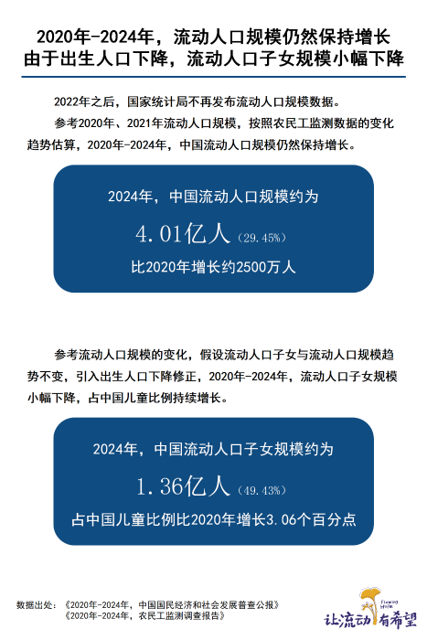 六一儿童节当天,我们发布了《中国流动人口子女现状 | 事实和数据2025》。基于国家统计局第七次全国人口普查数据,《2020年,中国人口普查年鉴》及历次人口普查和调查数据中关于中国儿童人口的描述分析,国家统计局、联合国儿童基金会、联合国人口基金联合发布《2020年中国儿童人口状况:事实与数据》,以及2013年-2024年《教育统计数据》、《全国教育事业发展统计公报》、《农民工监测调查报告》 、《国民经济和社会发展统计公报》《2023年全国教育事业发展简明统计分析》,以及北京、上海、广州、广东、江苏、浙江等2020人口普查年鉴年鉴数据整理。