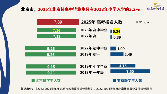 6月结束的2025年北京高考,报名总人数为7.89万人,其中非京籍高中毕业生约0.24万人。2025年参加北京高考的学生对应于2013年小学入学的学生,当年北京小学一年级在校学生总数为16.61万人,其中北京籍学生为9.11万人,非京籍学生为7.5万人。