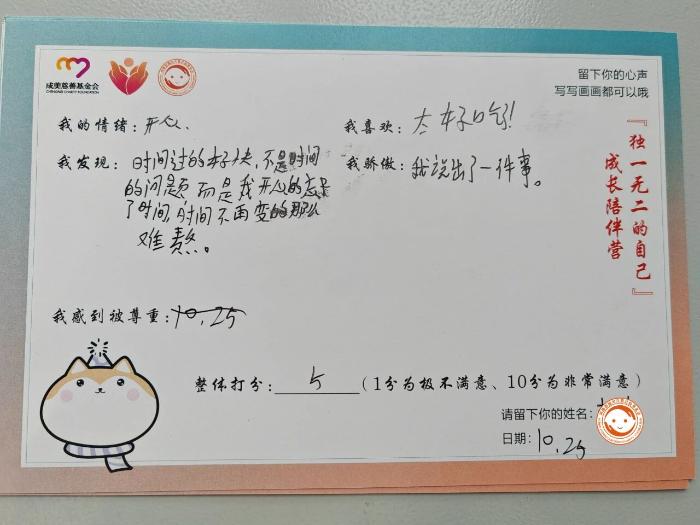 独一无二的自己成长陪伴营(线上)第二期圆满开展:10月4日-10日,为了更好的传递平等陪伴理念,让陪伴者先看见自己,再有更强的力量照亮孩子,我们发起了独一无二的自己成长陪伴营(线上)活动,第二期活动圆满开展,一线机构负责人、志愿者、社会公众等11名伙伴,在这7天里,都收获了属于自己的那一份“独一无二”,