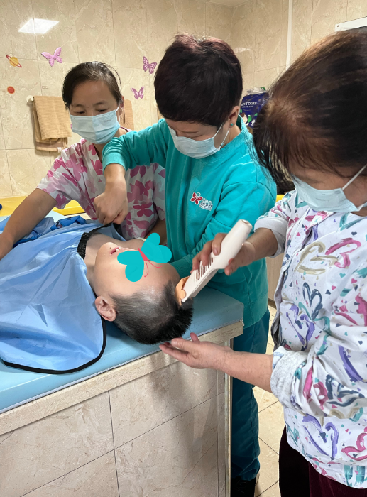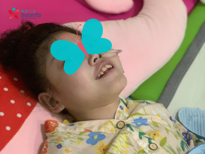 与此同时,一位曾转出“小蝴蝶”——Jill又回来了。最初几天,Jill状态波动较大,总是出现呕吐情况,一天需要更换好几次床单护理垫、衣服,好在经过护士及护理员密切关注与照护下,Jill渐渐稳定了些,也终于露出了腼腆的笑容。