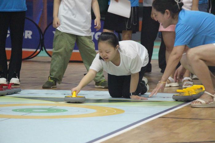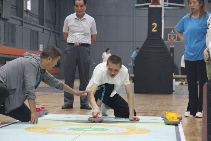 8月,学员们在志愿者的陪伴下走进旱地冰壶赛场,奋勇争先,在体育比赛中结交朋友。