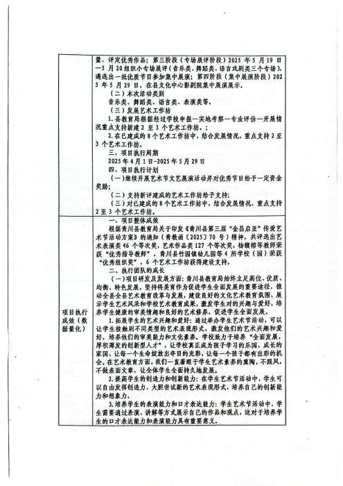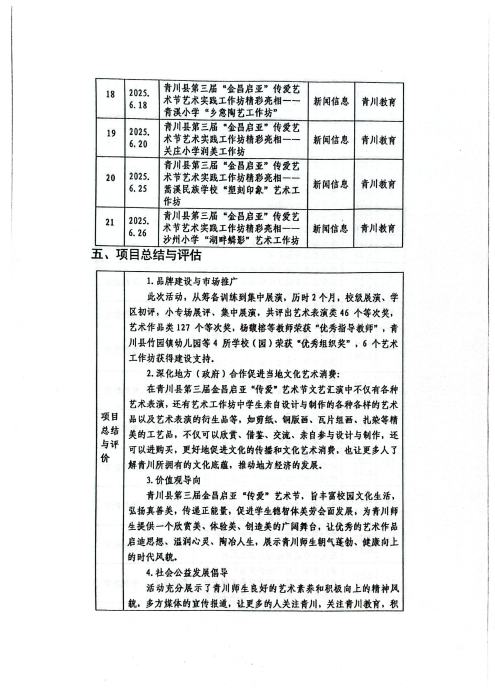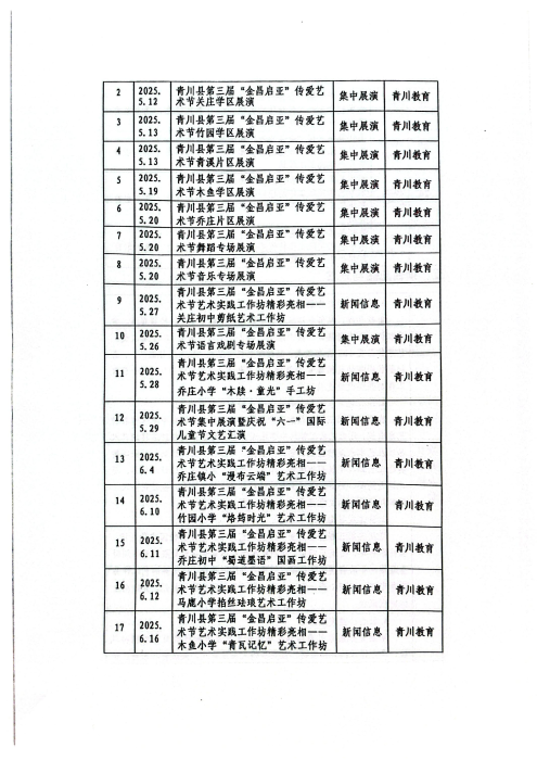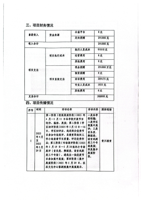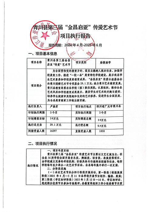 2025年5月26日,第三届“金昌启亚”传爱艺术节在青川县隆重举行。本次艺术节基金会捐赠30万元。活动期间,共收到书画手工作品486件,其中入展210件,获奖128件。艺术节目158个经校级展演、学区初评,专场展评、集中展演,共评出艺术表演类46个等次奖。参加艺术节的师生人数5000余人。