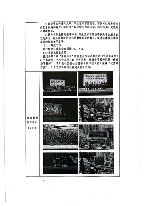 基本会为该项目捐赠30万元,通过艺术教育,孩子们可以接触到不同形式的艺术表达,如音乐、舞蹈、绘画等,从而拓宽他们的视野,培养对艺术的兴趣和欣赏能力。同时鼓励孩子们发展创造力和想象力,让他们能够独立思考、表达自己的观点和情感,培养创造性思维能力。积极寻找合适的艺术节项目执行地,对潜在的合作地点进行详细的教育调研,了解当地的文化氛围、教育资源、政府政策支持情况以及民众对艺术活动的兴趣和参与度。争取在2025年能够成功寻找到合适的地方教育局合作伙伴,再启动一个“金昌启亚”艺术节的开展。