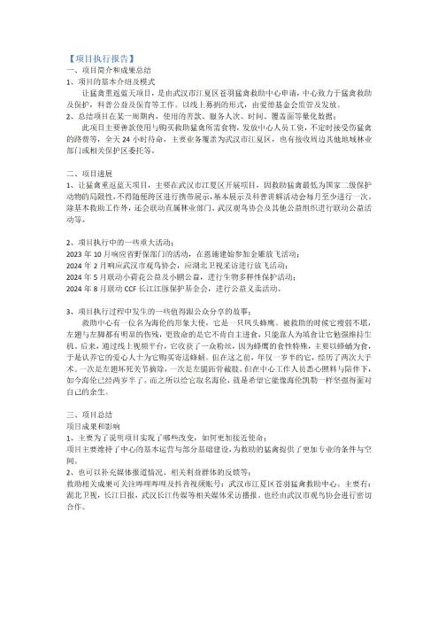 感谢爱心网友的支持,项目目前已执行完毕。本项目筹款24264.00元,实际总支出24264.00元(含管理费)。本期项目共救助伤残鸟类200余只,开展公益活动30余场。武汉市江夏区苍羽猛禽救助中心持续向广泛大众扩散知名度,以及协同本地各公益项目组织各类讲堂及科普活动。不光救助个体伤残猛禽,更致力于科普大众保护意识与必要性,让更多人加入这个团队。