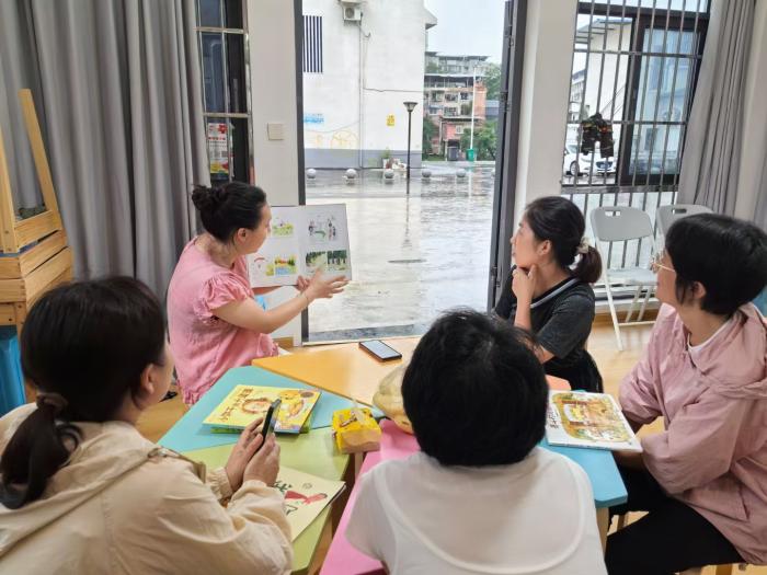 基于前期教师在班大声朗读的反馈收集和走访实践交流的结论,我们有针对性的发起教师成长陪伴活动,线上共读活动“绘本中的感知与共论”,和线下“情景读写实践分享”的教师工作坊,老师们结合自己的真实感悟和教学场景,层层深挖绘本和孩子生活场景的实践路径。