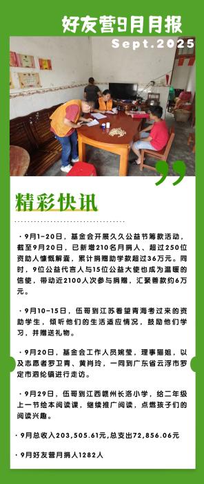 ——截至9月20日,已新增210名月捐人、超过250位资助人慷慨解囊,累计捐赠助学款超过36万元。同时,9位公益代言人与15位公益大使也成为温暖的信使,带动近2100人次参与捐赠,汇聚善款约6万元。