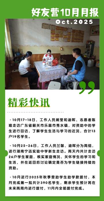 2.10月17-18日,工作人员婉莹和迪晖、志愿者陈瑜走访广东省韶关市乐昌市秀水镇,对资助中的学生进行回访。了解学生生活与学习的近况,合计13户19名学生。