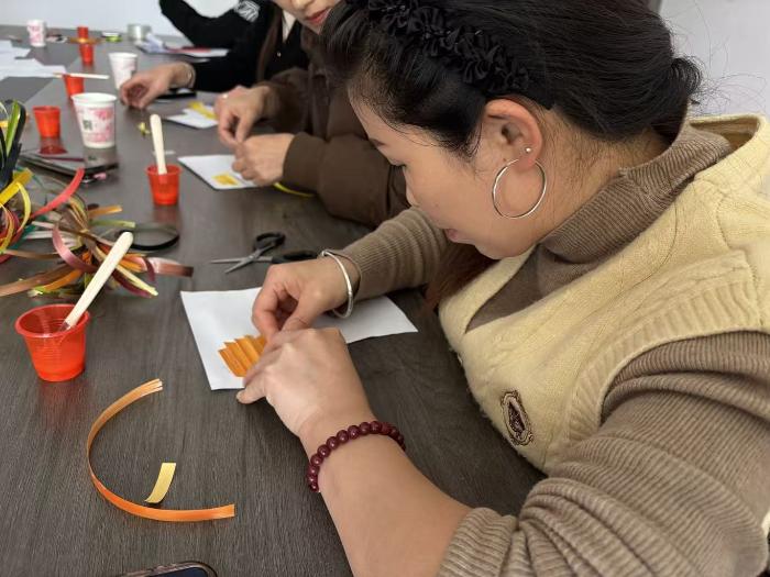 本次活动特邀麦秆画非遗传承人文婧现场授课。文婧老师首先为大家讲解麦秆画的历史渊源与文化价值,分享其源于农耕文明的深厚背景,并介绍熏、蒸、漂、剪、贴等多道独特工序,让妇女们近距离感受这项“民间艺术一绝”的非凡魅力。随后,老师现场演示麦秆的裁剪、拼接与粘贴技巧,普普通通的麦秆在她手中逐渐变成栩栩如生的图案,吸引大家纷纷驻足观看、认真记录要点。