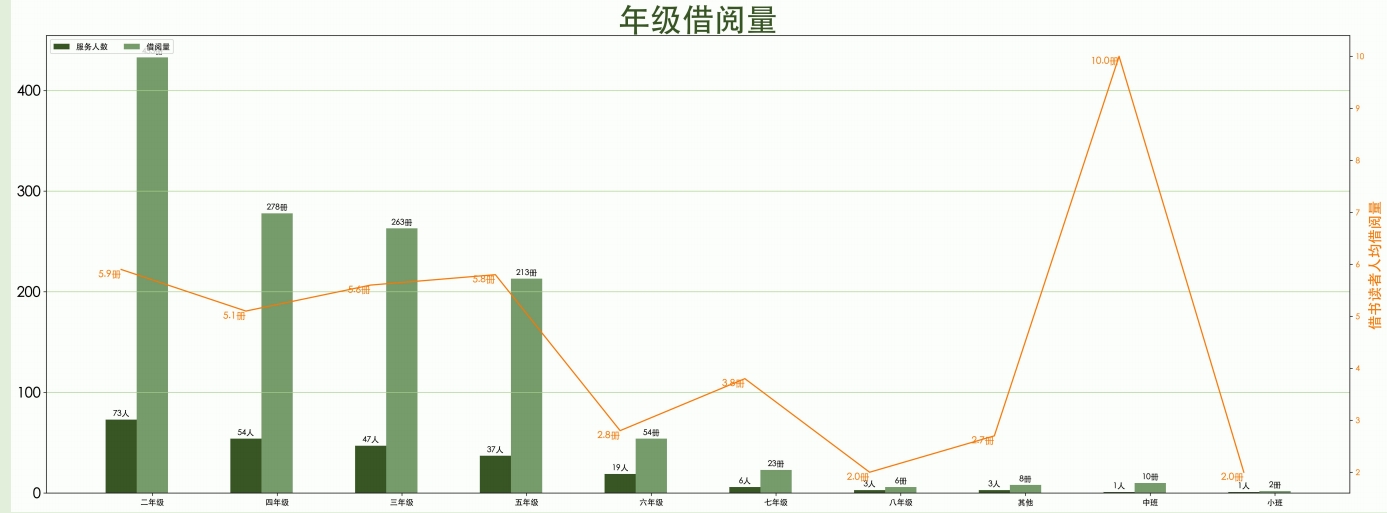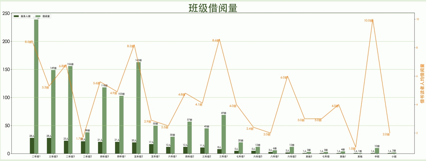 (1)借阅数据:截至当前,馆内图书6千余册,注册读者500余位。人均借阅册数24.45册,单月借阅量维持在1200-1600册之间。其中借阅主力主要为小学3-6年级学生。