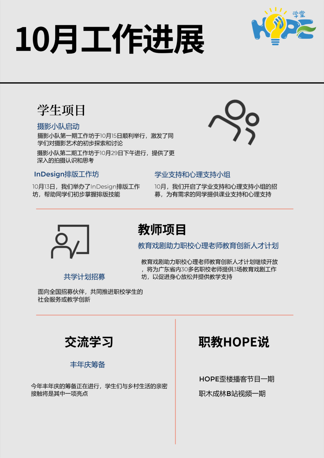 10月,HOPE学堂成功举办了两次工作坊,参与者通过实践拍摄并分享了身边的事物。此外,还开展了InDesign排版工作坊,帮助大家掌握了书籍和杂志的排版技能。同时,HOPE学堂也开启了补习小组和心理支持小组的招募,为有需求的学生提供学术和个人支持。