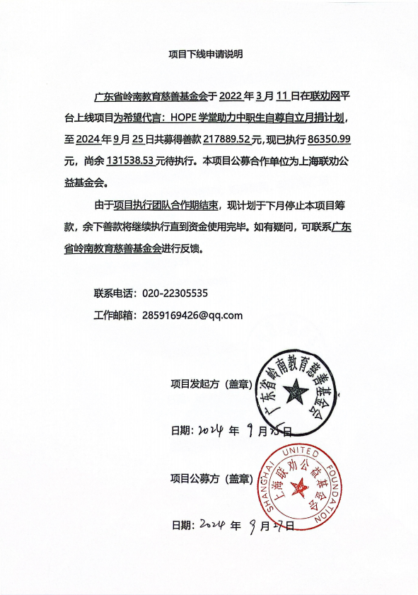 由于项目执行团队合作期结束,现计划于下月停止本项目筹款,余下善款将继续执行直到资金使用完毕。如有疑问,可联系广东省岭南教育慈善基金会进行反馈。