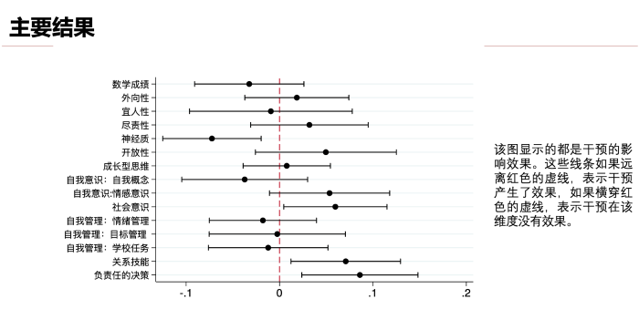 与对照组学生相比,“快乐成长”的社会情感学习(Social Emotional Learning, SEL)干预使学生的社会情感能力显著提升了0.08到0.13个标准差。具体为,学生的自我认知(学生知道自己的优势)、社会意识(了解被人是否需要帮助、向别人学习、出现问题如何寻求帮助)、自我管理(情绪)、人际关系(与同学、老师的相处)都有显著的改善。另外,与对照组相比,SEL干预使学生的神经质特征(焦虑、抑郁和冲动等)显著降低了0.10个标准差,改善了学生的焦虑情绪。
