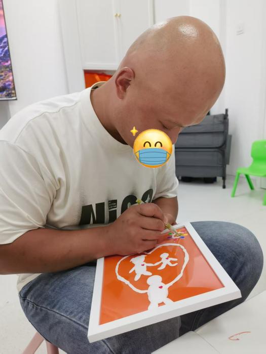 1岁多的小泽是最近刚确诊的宝宝,他的眼睛里还有对治疗的恐惧,但爸爸用干活的大手将他和妈妈仅仅包裹,尽管是第一次做手工,但爸爸从捏造型,上色,完善画面,每一步都做得一丝不苟;