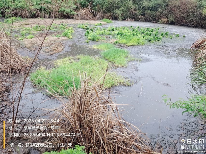 而茶陵兴家旺水库和茶陵野生稻国家湿地公园上游水田、池塘的污染问题尤为突出。水库中大量粪便堆积冒泡,水田池塘粪便四溢,竹子被“烧死” ,排污管道赫然在目。团队第一时间将问题反馈至当地生态环境分局,并持续跟进。