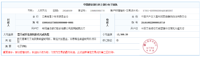 由广大爱心人士捐赠爱心善款已于2024年5月9日划拨12569.2元至中国共产主义青年团楚雄州委员会用于希望鼓号队援建(项目资金包含“云工商团委希望鼓号队”10223.19元,“华泰智远希望鼓号队”2250.01元)