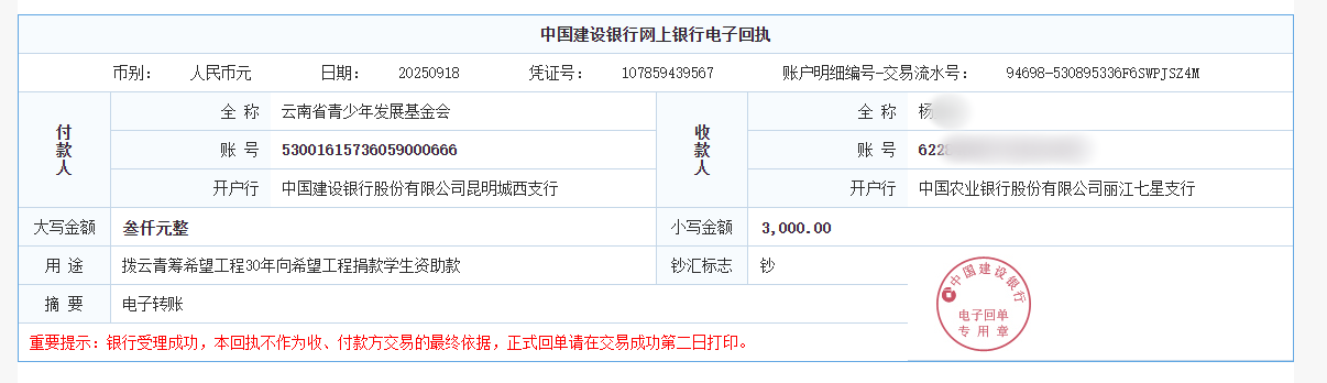 2025年10月14日由广大爱心人士捐赠爱心善款1131.34元已整合2021年“云南希望工程爱心圆梦大学”项目款25476.80元、2022年“云南希望工程爱心圆梦大学”项目款109592.04元、2023年“云南希望工程爱心圆梦大学”项目款18011.49元、2025年“云南希望工程爱心圆梦大学”项目款1788.33元及“爱心圆梦·为爱充值”项目款24000元,共18万元用于资助45名大学新生,每名学生一次性资助4000元。