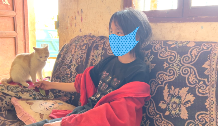 “奶奶,是谁呀?”屋里传来清脆的声音。一个扎着马尾辫的14岁女孩抱着小猫从门后探出头,圆圆的眼睛打量着我们——这就是小花。