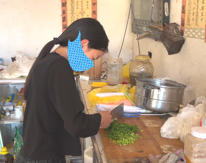 刚坐下没多久,厨房便传来声响。我们跟着走进去,只见小花踮着脚尖,小手紧紧攥着菜刀,正利落地切着青菜。砧板上的菜丝粗细均匀,完全不像一个14岁女孩该有的手艺。