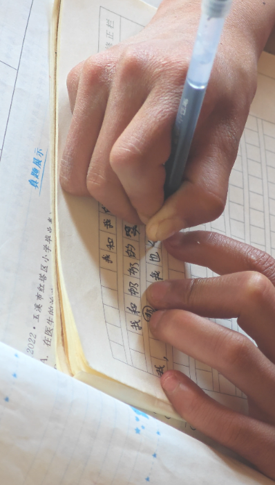 我们趁机和她聊起学习,她眼睛一亮,拉着我们回到家,从桌肚里翻出一个旧作文本,趴在桌上一笔一划地写了起来。