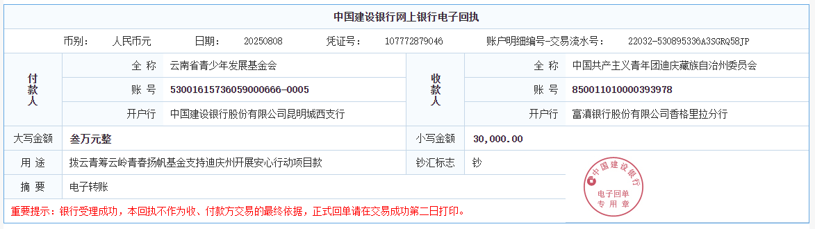 第二十期拨款:由广大爱心人士捐赠爱心善款已于2025年8月8日划拨30000元至中国共产主义青年团迪庆藏族自治州委员会,用于开展迪庆州关爱青少年“安心行动”项目。